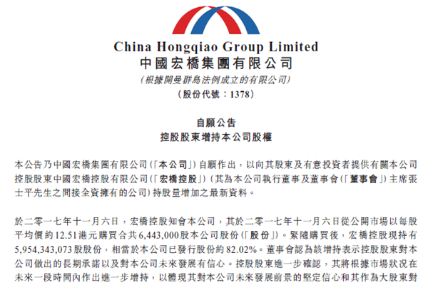中國宏橋近日發(fā)布公告稱,其控股股東宏橋控股知會公司,將于2017年11月6日從公開市場以每股均勻價約12.51港元購置合共644.3萬股公司股份。緊隨購置后,宏橋控股現(xiàn)持有約59.54億股股份,相當(dāng)于公司已發(fā)行股份約82.02%。記者從公開材料查詢后發(fā)現(xiàn),宏橋控股為公司執(zhí)行董事及董事會主席張士平間接全資具有的公司。